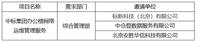 按照《中国标准科技集团有限公司采购工作管理办法(试行)》要求,现对中标集团办公楼网络运维管理服务项目竞争性谈判邀请单位公示。